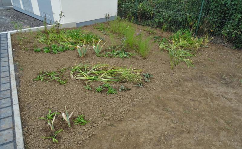 und hier sieht man den beneidenswert grünen Rollrasen gegenüber sowie rechts meine 0,0018 ha trockenen Südhang, im Frühjahr begonnen, im Sommer leider etwas vertrocknet, mit dem Revier von Elisabeth und Philipp