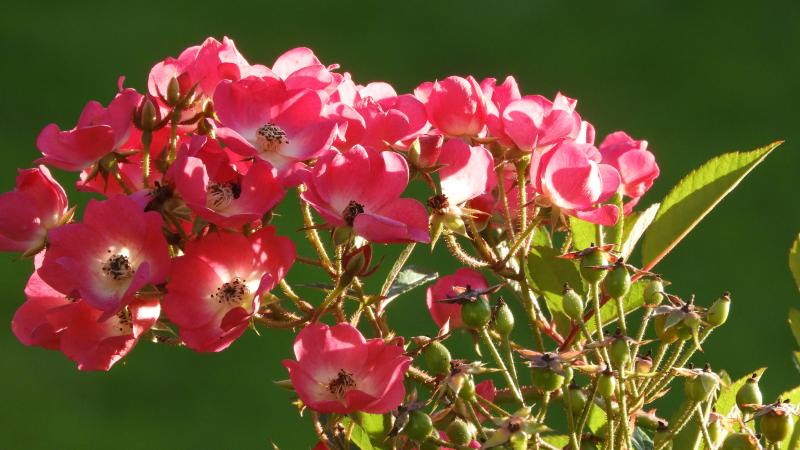 Ich hatte sie noch nicht beschnitten, und deshalb gibt es Blüten und Hagebutten gleichzeitig.
