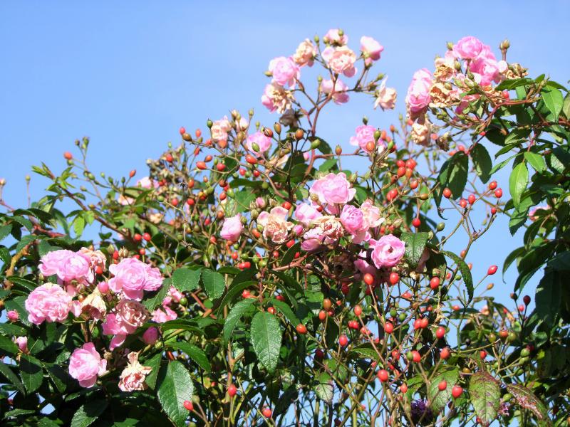 Ich hatte sie noch nicht beschnitten, und deshalb gibt es Blüten und Hagebutten gleichzeitig.