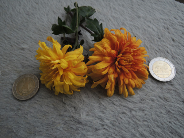 Ich war heute im Garten einer Freundin, und da bin ich über eine Chrysantheme "gestolpert", die da grade blüht. Sie stammt aus einem alten Garten, der aufgelöst wurde, Namen gibts natürlich nicht. Hier ein Foto für troll13, zwei typische Blüten habe ich mitgenommen, sind von einer Pflanze.