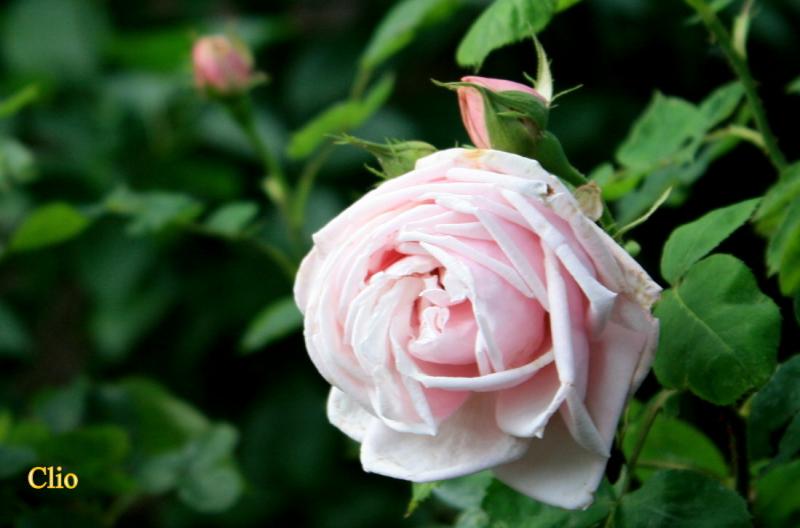 Hier die zweite meiner Remontantrosen, Clio von 1897, sie hat einen aufrechten Wuchs, der Duft ist zart. Die Blüte ist ballförmig in einem hellen rosa, die Blüten hängen leicht über.
