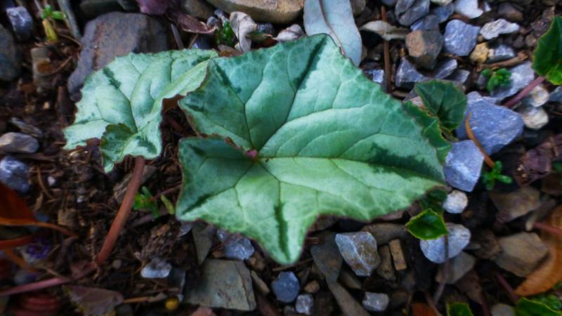Dies ist ein C. hederifolium namens " Some White "-- eine schöne Blattzeichnung, wie ich finde, mit einem kaum zu erahnenden strichförmigen Tannenbaum, Blüte ist reinweiß.