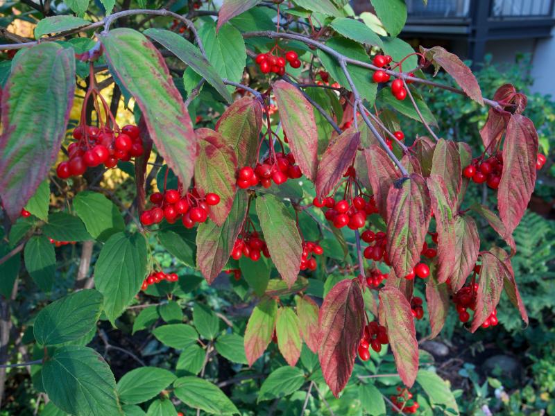 Viburnum setigerum ist ein unterschätzter Strauch - er wächst zwar zunächst etwas sparrig, lässt sich aber problemlos in Form halten. Die Beeren halten hier manchmal bis Weihnachten.