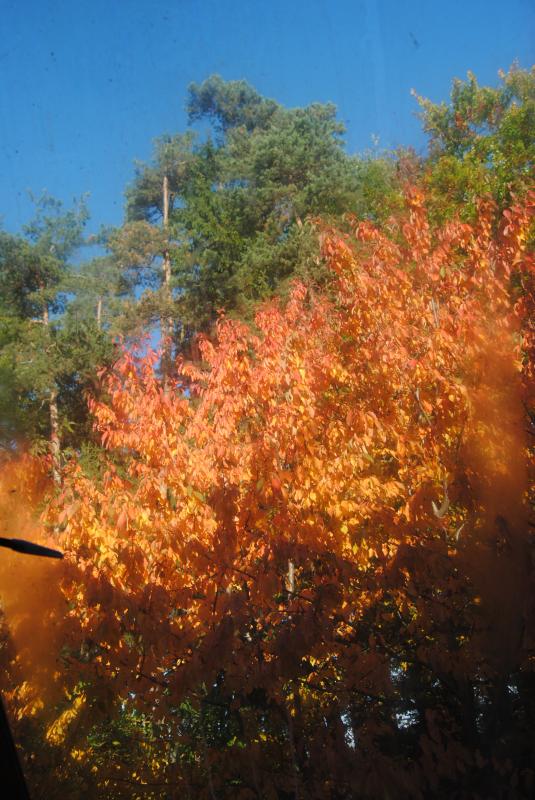 Aus dem Stiegenhausfenster im 2. Stock fotografiert. Der Kakibaum leuchtet grad so nett. Mittlerweile zähle ich 11 Kakis :D