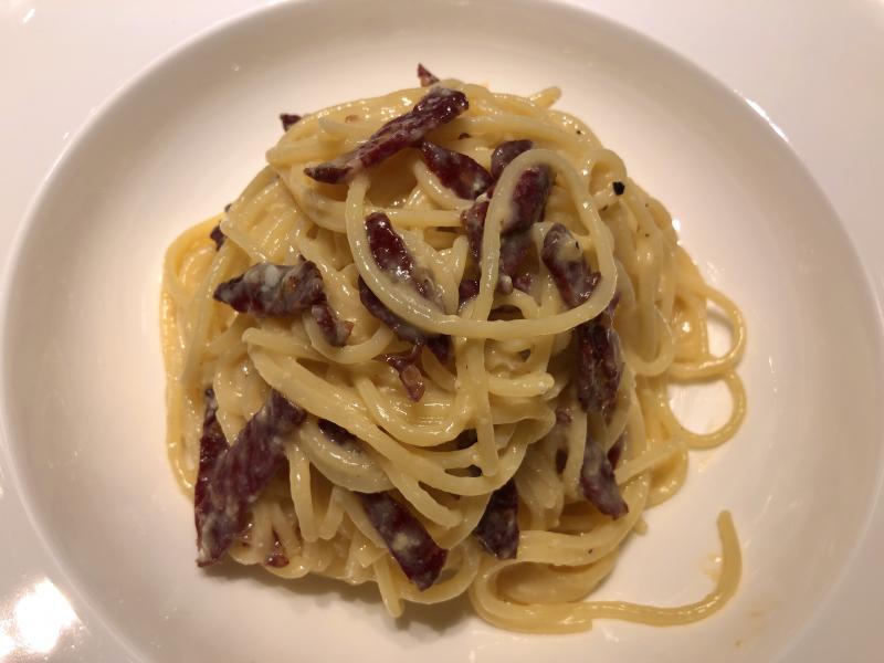 hier gab es spaghetti alla carbonara – mit cacciatore vom pferd. 8)