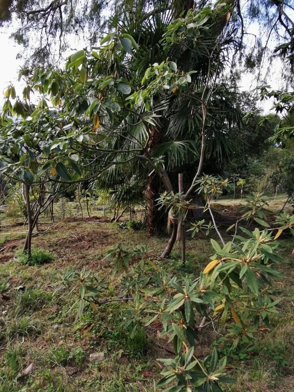 Einige haben im Sommer nach dem Umzug nur verkleinerte Blätter gebildet, was aber nächstes Jahr wieder im Normabereich sein wird. In der rechten Bildmitte die nun ausgepflanzte Rododendron sinogrande CCHH 8079, die zwei Blütenknospen angesetzt hat