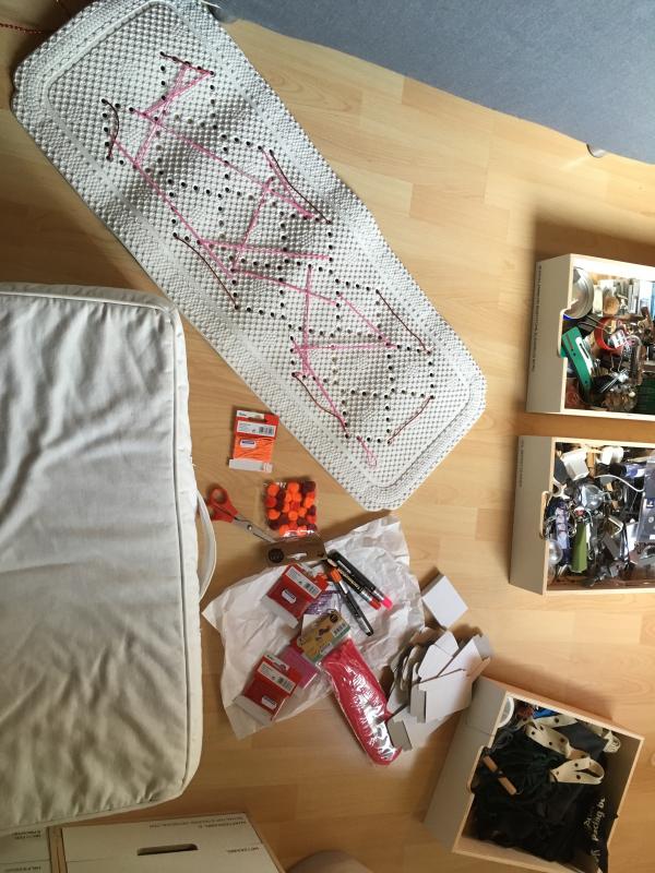 Jetzt ist noch Experimentierphase. Involviert sind Elastikschnüre, ein roter Aludraht (ich trau der Stabilität von altem Plastik nicht), Kartonschächtelchen und rosa Pfeifenputzer. Mal sehen... erstmal gibts die Matrix: Die Elastikschnüre spann ich kreuz&quer drüber und klemm dann die Kartönchen drunter.