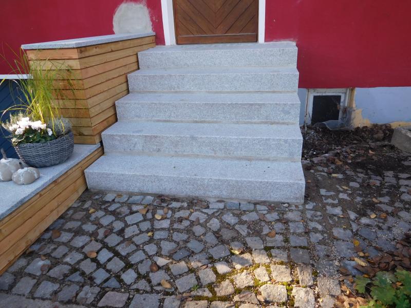 wir haben einen neuen Hauseingang (Treppe und Stützmauer) bekommen, verwendete Materialien sind Granit (Treppe) und Lärchenholz (Verkleidung Mauer).