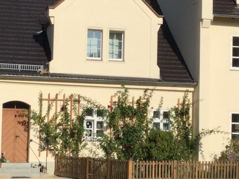Also, Rose wär's doch an der Stelle! Aber warum nicht klettern lassen? Keine Kletterrose, aber eine, die bereit ist, wenn man ihr was zum Festhalten anbietet, hochzuwachsen. Wenn Ihr nichts an der Fassade anbringen wollt: Wir "dürfen" in unseren Aussenwänden nichts verankern wegen Dämmung. Deshalb haben wir Stahlseine vom Boden bis unter die Traufe gespannt und dort in der Holzverschalung verankert; hält ohne Nachspannen seit 20 Jahren!