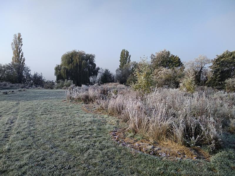 Hier gibt es keinen Frost und keinen Rauhreif. Das hat vor- und Nachteile. Aktuell versinkt der Garten im Wasser...