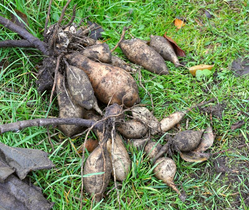 Ich habe die erste Yakon ausgegraben. Das war von allen die kleinste Pflanze, die einzige, die ich über den Winter gebracht hatte. Besonders viel hing nicht dran, das war letztes Jahr mehr, trotz ungünstigerem Standort. Ich habe die Knollen nicht gewogen, aber das könnte ca. 1 kg sein. Eine von den beiden Brutknollen habe ich leider etwas beschädigt. Die Brutknollen habe ich erst mal wieder in der Erde geparkt, ich weiß noch nicht, wie ich sie am besten überwintere. Unser Keller ist leider immer noch recht warm.