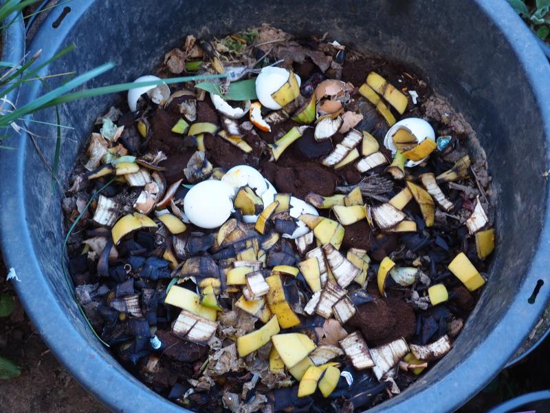 auf die Kaffeesatz, Eierschalen, Bananenschalen, Obstschalen, Teebeutel ... kommt immer eine Schicht des Bodenaushubs.
