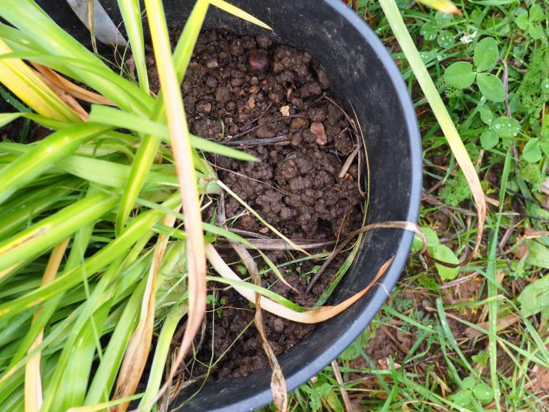 damit topfe ich, zum Beispiel Taglilien. Wie man sieht, macht diese Erde die Regenwürmer glücklich.