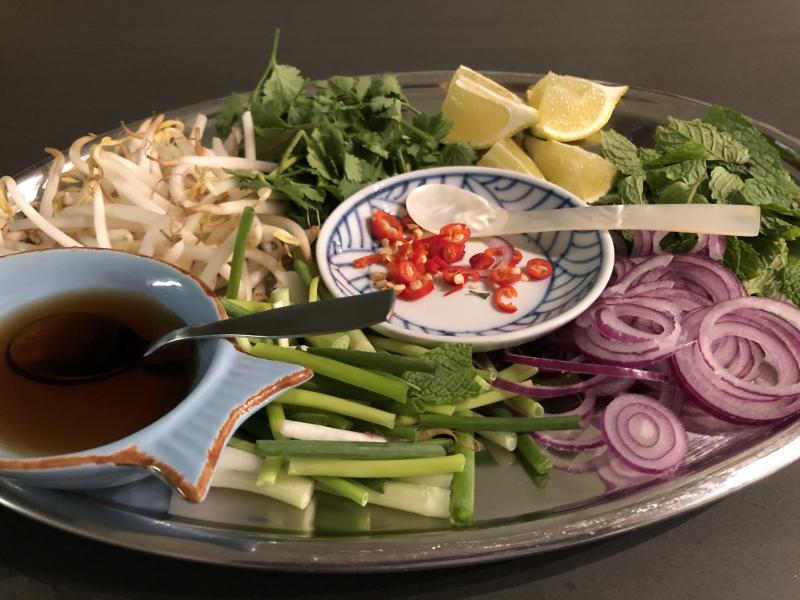Hier noch ein Nachtrag zur Pho Bo. Die gab es heute wieder. ;) :D Das Foto das Thomas gezeigt hatte war ja noch nicht die fertige Suppe. Die Garnitur dazu besteht aus Frühlingszwiebeln, Koriander, Chili, Minze, Zwiebel, MungoBohnensprossen, Fischsoße und Limettenstücken zum auspressen.