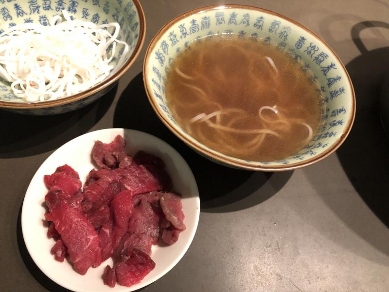 In die Suppenschalen kamen vorgegarte ReisNudeln und dünn geschnittenes rohes Rindfleisch.