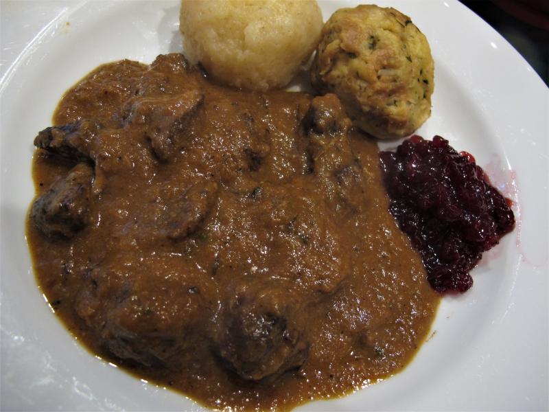 Gestern gab es nach dem Markt Krautsuppe und Marillenpalatschinken, heute Rehragout mit - praktischerweise - Erdäpfel- und Semmelknödeln aus dem Tiefkühlfach, Preiselbeeren und Endiviensalat.