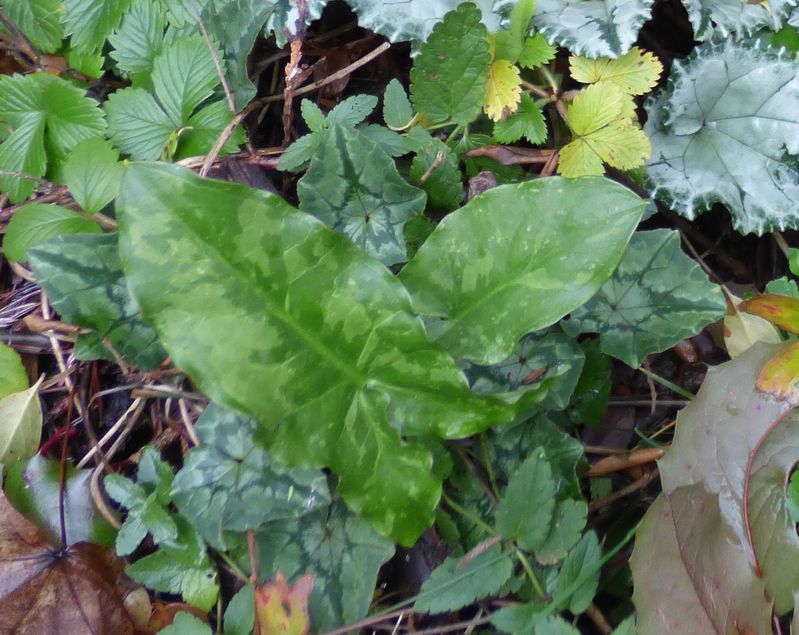 Arum creticum ist es nicht, denke ich, wobei der auch gerade austreibt... vermutlich ist es Arum italicum.