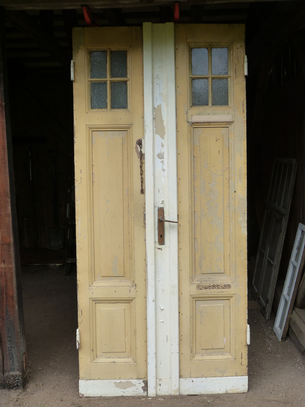 Nun war die andere Seite ja immer noch offen. Es fehlte als eine Tür. Die Suche danach gestaltete sich gar nicht so einfach, weil es natürlich eine alte Tür sein sollte, das Maß und der Anschlag passen mussten und zum Häuschen musste sie auch noch passen. Von einer bekam ich zunächst nur ein Foto und in die verliebte ich mich auf Anhieb. Leider war ausgerechnet die nach außen zeigende Seite platt mit Holz vernagelt. In den Heiligen Hallen meines Holzwurms haben wir daraufhin Tür um Tür von links nach rechts gestapelt, ohne dass ich mich recht entschließen konnte, ich landete immer wieder bei der allerersten Auserkorenen. Letztlich nahmen wir ein Brecheisen und entfernten die Holzplatten von der Außenseite, zu Tage kamen dann tatsächlich die alten Kassetten. :D Da war die Entscheidung gefallen. :)