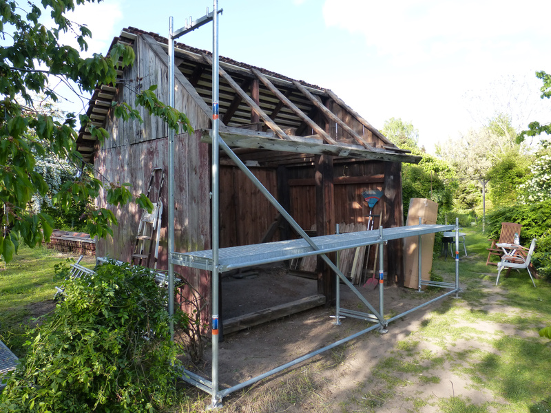 Nun sollte es ja nicht einfach weiter der Schuppen zum Vollrümpeln sein, sondern tatsächlich auch ein nutzbares Gartenhäuschen werden. Der Holzwurm war oft zu Besuch und wir saßen im Schuppen, sinnierend, wie er wohl künftig aussehen soll. Mit jedem Palaver kam uns eine neue Idee, oftmals eingeleitet mit den Worten "Ich habe da ja noch irgendwo dies und das...". ;D