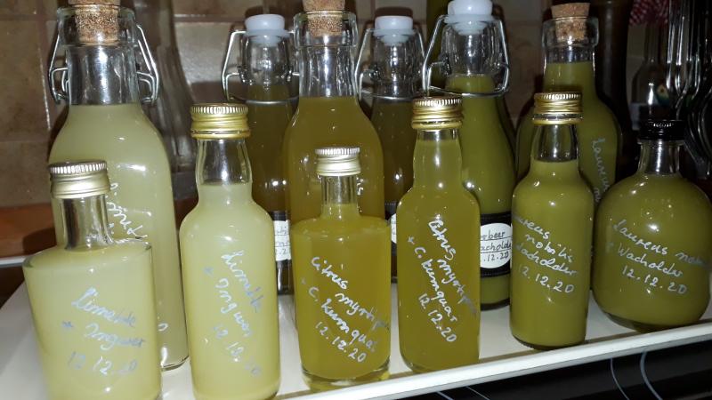 Ich bin mit der Herstellung solcher Liköre nicht so bewandert und war sehr überrascht, dass alle drei erst kristallklare Flüssigkeiten durch die Zugabe von Wasser milchig trüb wurden. Liegt wohl an den ätherischen Ölen in den Ansätzen? Bei den CitrusAnsätzen stört das nicht sonderlich, bzw man kennt es ja von Limoncello. Aber bei dem erst klar und dunkelgrünem Ansatz mit dem Lorbeer sieht das milchige Grünrecht gewöhnungsbedürftig aus. Erinnert farblich etwas an einen Smoothie 8) :-X