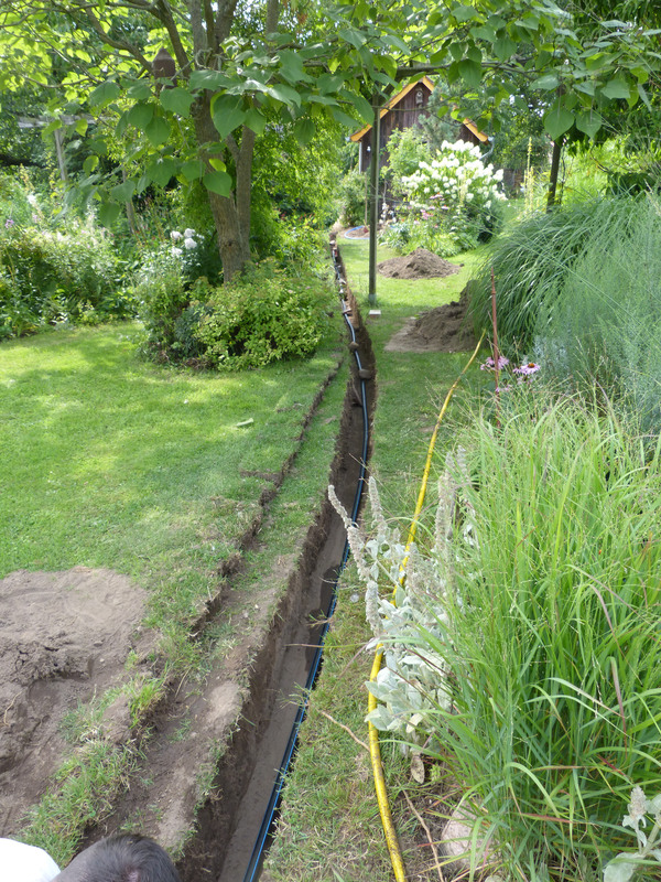 Da war das Stromkabel schon verlegt und der Graben wieder auf die Höhe für die Wasserleitung verfüllt.