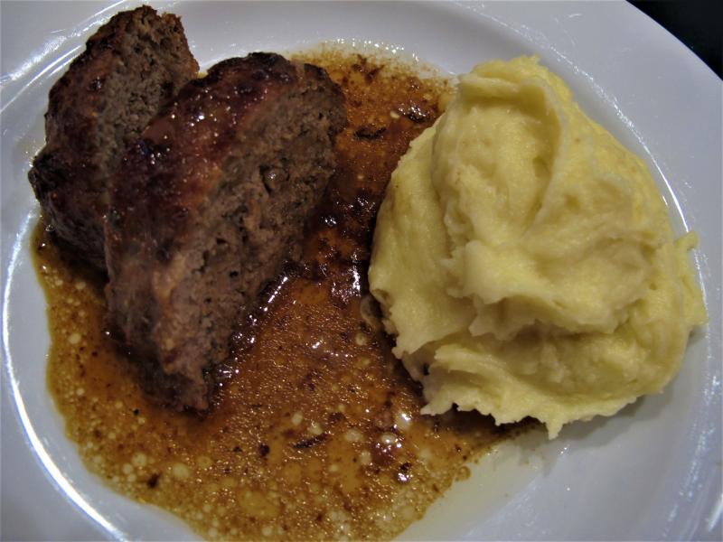 Hier gab es faschierten Braten, Kartoffelpürree, Rote Rüben-und Chinakohlsalat, Letzteren mit Kürbiskernöl.