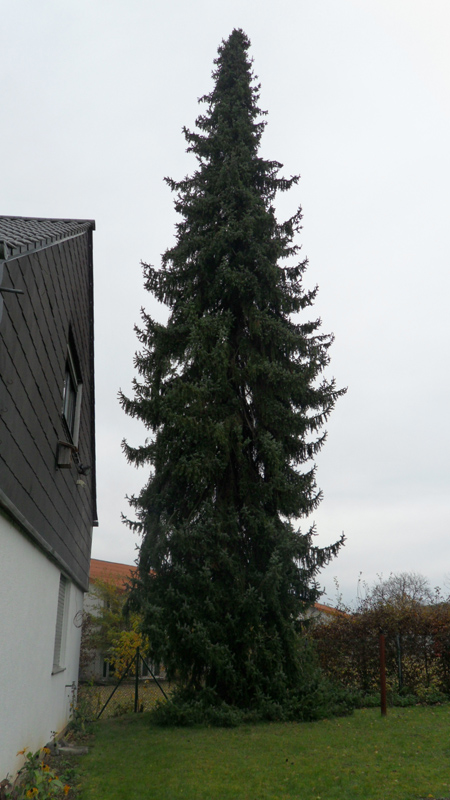 Das waren auch mal drei Fichten, die zusammenstanden. Bei einem Orkan, ich glaube es war Lothar (?) so vor rund 20, 25 Jahren, erwischte es zwei dieser Fichten, die kippten längs in unseren und den Nachbargarten. Ich bin auch unschuldig an diesen Bäumen, die haben meine Eltern gepflanzt.