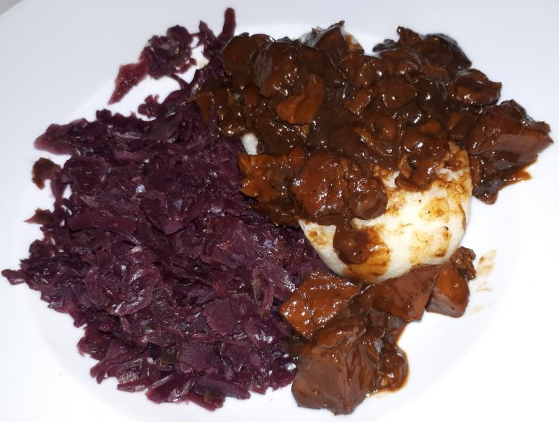 Gestern gab es Rotkohl, Klöße, Saitan und getrocknete Maronenröhrlinge in Dunkelbiersoße und Endiviensalat