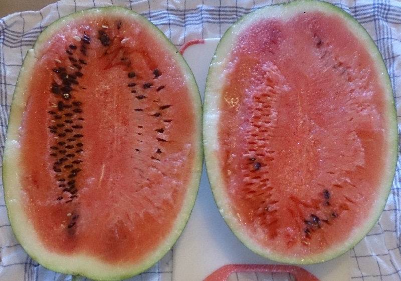 So, ich hab mal die Zeit gefunden meine Saison aus zu werten. War doch mehr als gedacht. 46 Wassermelonen mit 191,521 Kilo, die ungenießbaren natürlich nicht mit gezählt, Durchschnittsgewicht 4,164 Kg. Die Schwerste war die unveredelte Orangeglo im Tunnel mit 10Kg. Top Pflanze aber insgesamt recht schlechte Qualität (faserig, fest, innen Risse) war eine veredelte Desert King mit 14 Früchten und insgesamt knapp 75Kg Ertrag. Dahinter mit 29,1Kg die veredelte Ali Baba bei 4 Früchten die auch nicht so dolle war, aber deutlich besser als die Dessert King. Und die dritt beste Pflanze, eine veredelt Yamato Cream mit 7 Früchten und 27,283Kg. Da hatten alle Früchte durchgehend top Qualität, erstaunlich lagerfähig und dank hauch dünner Schale auch viel Inhalt. Allerdings mochte ich den speziellen Geschmack nicht so gerne. Ansonsten war die die perfekte Pflanze. Die drei Sorten baue ich alle nicht mehr an, wobei mir die einzelne Desert King Frucht aus dem Topf deutlich besser und richtig gut schmeckte, aber die Pflanze auch dort schon den Drang zum hohen Platzbedarf zeigte.
