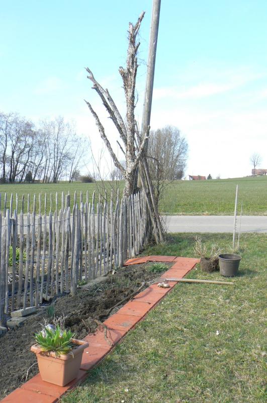 An der Ostseite vom hinteren Garten war die Wiese so uneben, dass ich bei jedem Mähen fürchtete, entweder den Zaun oder den Balkenmäher zu schrotten. Deshalb habe ich hier noch ein Beet angelegt.