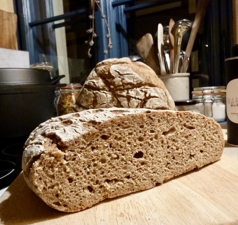 Erst mal Fehlersuche, dann festgestellt, dass die Sicherung gekommen war. Sicherung wieder rein, nach dem Herd schauen: Scheint zu funktionieren. Blöd war bloß, dass ich keine Ahnung hatte, wie lange der Ofen schon aus war. Letzten Endes habe ich im Blindflug gebacken, irgendwann den Deckel abgenommen, schließlich das Brot rausgeholt. Und wieder in den Ofen geschoben, weil es noch zu blass und irgendwie zu weich wirkte. Inzwischen steht es in der Küche und kühlt aus und ich bin gespannt, wie es von innen aussieht, wenn ich es heut Abend anschneide ... :-X