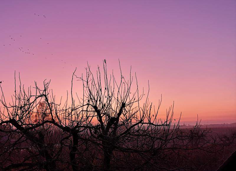 Heute früh -3,1, tagsüber 4,9, aktuell 0 Grad. Aber die Sonnenaufgänge sind gerade ganz ansehnlich.
