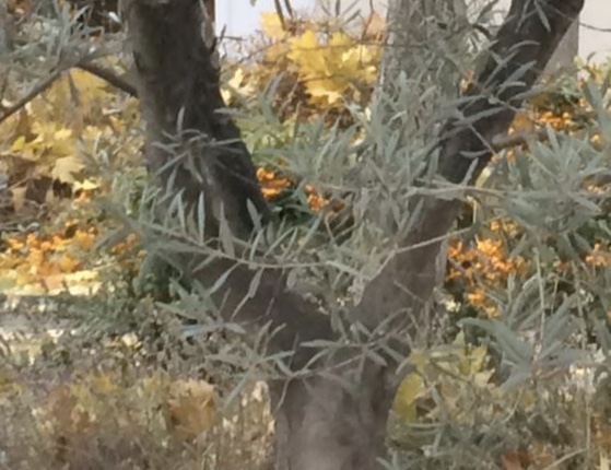 Salix rosmarinifolia wäre auch möglich, die behalten ihr Laub sehr lange. Birne glaube ich nicht, da sin die Zweige selten so gerade.