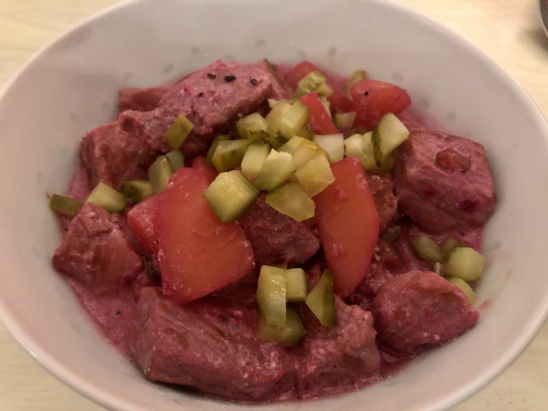 hier eine hommage an osteuropa: bio-schweinefleisch mit kartoffeln, rote bete-miso, saurer sahne und gewürzgurken – schrill. 8)