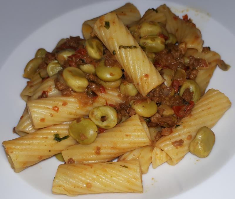 Heute Resteverwertung: dicke Bohnen mit Tofuhack, aufgepimpt mit Tomaten und Pasta, dazu Gartenendivien
