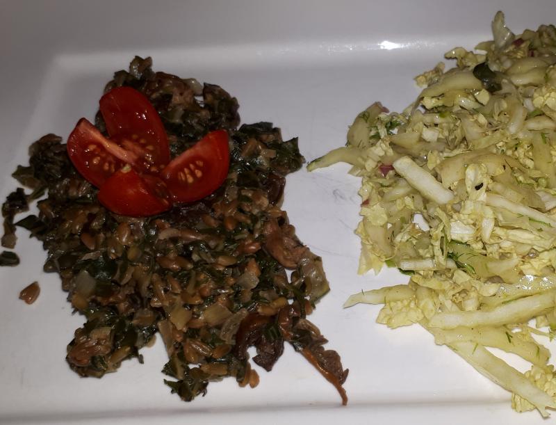 Heute Grünkern mit dem allerallerletzten Gartenmangold, getrockneten Maronen, saurer Sahne und Käse, dazu Chinakohl- Fenchel- Salat