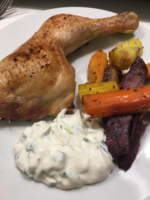 Gestern Hähnchenschlegel mit Süsskartoffeln, Karotten und Kartoffeln vom Blech, dazu Tzatziki