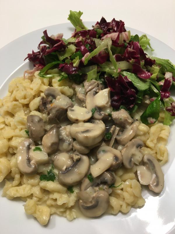 Und heute sehr gelungenes eingemachtes Kalbfleisch (Danke für die Anregung ;) ) mit Champignons, Spätzle und Hochbeetsalat :P