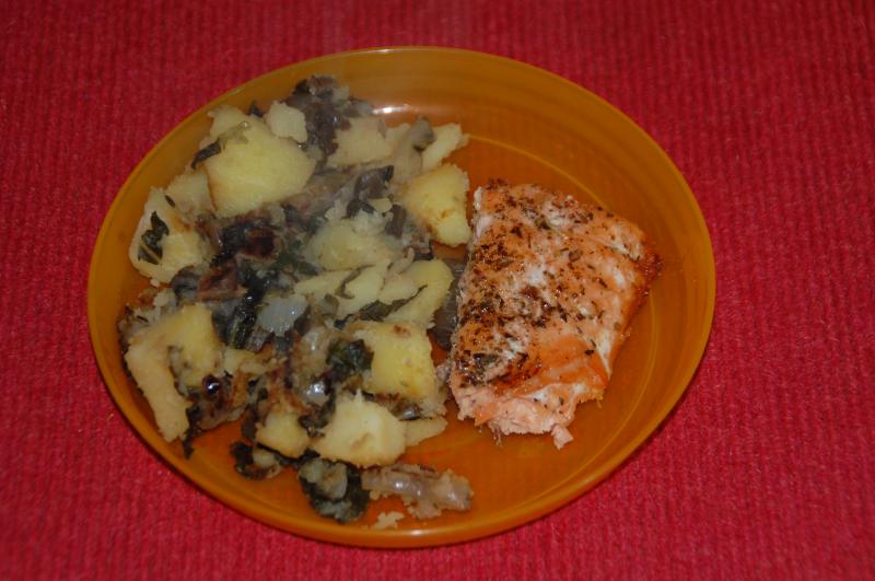 Heute gab es dalmatinische Mangoldkartoffeln (Mangold, Kartoffel, Knoblauch, Zwiebel, Olivenöl, Salz, Pfeffer, Liebstock, Kreuzkümmel) mit dem Rest vom Lachs - sehr lecker.