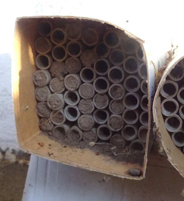 Megachile versicolor, die Verschiedenfarbige? Blattschneiderbiene hat die Nistgelegenheit im letzten Sommer hier mit Begeisterung angenommen. Die mitbestellten 18 cm langen Schilfbündel werde ich mit meinen langen Rundfeilen nachbearbeiten, es gab sogar ein drittes Weihnachtsbündel gratis zum Doppelpack :D.