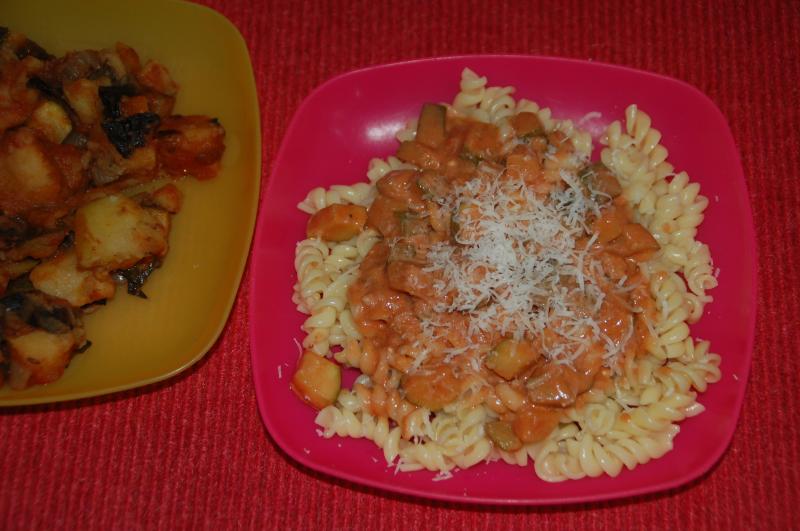 Fusilli mit Tomatensoße (Zucchini, pass Tomaten, Salz, Pfeffer, Creme fraiche) und Parmesan