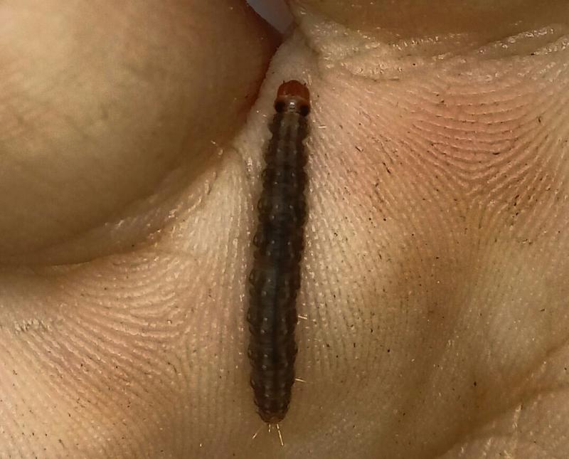 Das ist eine ältere Apfelwicklerraupe, die sich bald verpuppen wird. Das macht sie normalerweise im Boden oder hinter Rindenschuppen.