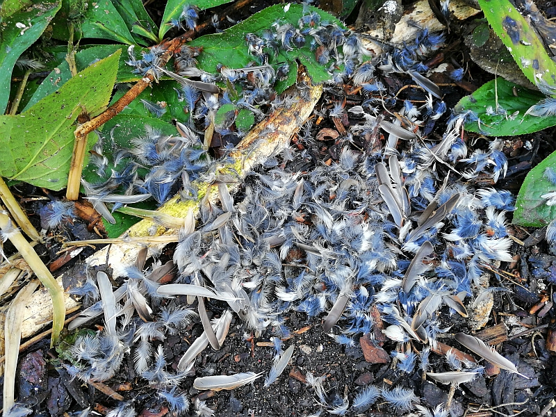 Gestern fand ich einen Haufen Federn unter der Futtersäule. Wer macht sowas? Eine Katze doch hoffentlich nicht. Ein Sperber vielleicht?
