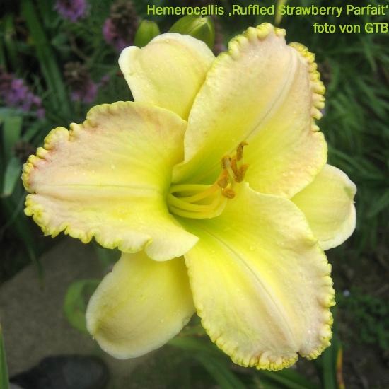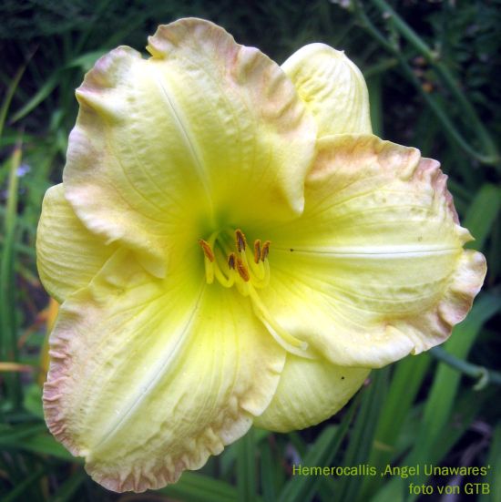 Die dritte Taglilie, die bei mir im Moment noch blüht, ist 'Gentle Shepherd'. Dafür, dass es den ganzen Morgen ununterbrochen geregnet hat, sieht die Blüte hervorragend aus. Nachmittags wird sie dann in der Regel etwas weißer.Liebe GrüßeElke