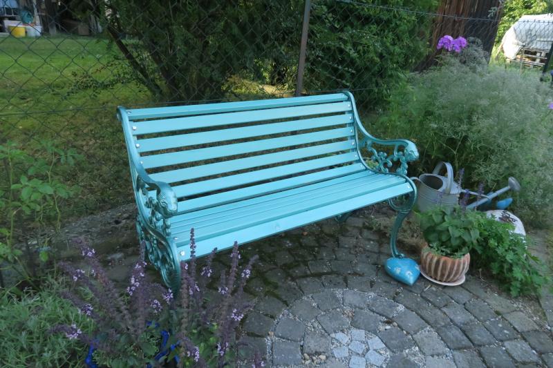 Ich hab mir bei ebay Kleinanzeigen zwei alte eiserne Seitenteile gekauft, entrostet und gebürstet. Der Schreiner hat mir passende Lärchenbretter geschnitten. Alles hab ich ganz speziell Ton in Ton bemalt und bin ganz begeistert von meiner neuen Bank, die sonst niemand hat.
