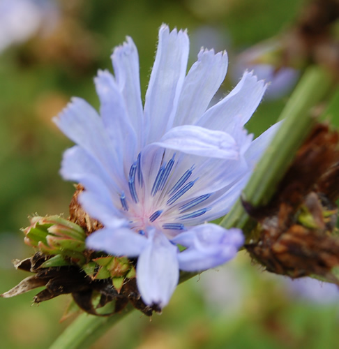 Di Blütenblätter der Wegwarte sind etwas unscharf, dagegen sind die Staubfäden wie kleine Eiskristalle