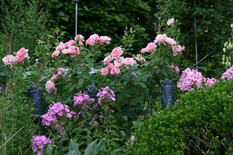 Die Rosarium Uetersen habe ich als Strauchrose gezogen, hatte sie auch schon mal als Kletterrose. Die ist auch sehr dankbar. Links der Rittersporn lebt leider nicht mehr. Rechts im Vordergrund ist wieder das "Hemadknöpfe".