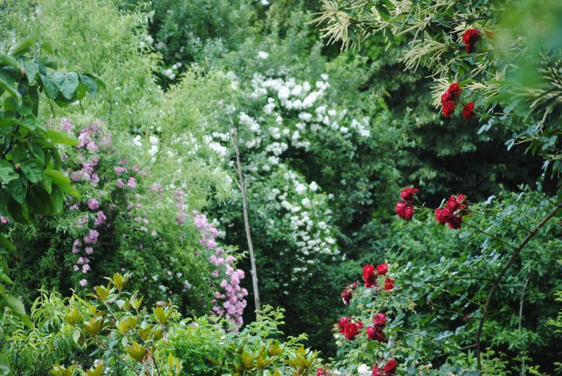 Leider lausiges Foto: Rosen Ton in Ton mit Stockrosen.