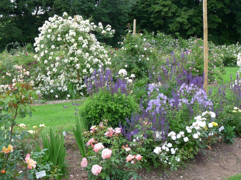 Blaue und violette Campanula und Salvien zu Rosen gehen auch immer, finde ich.