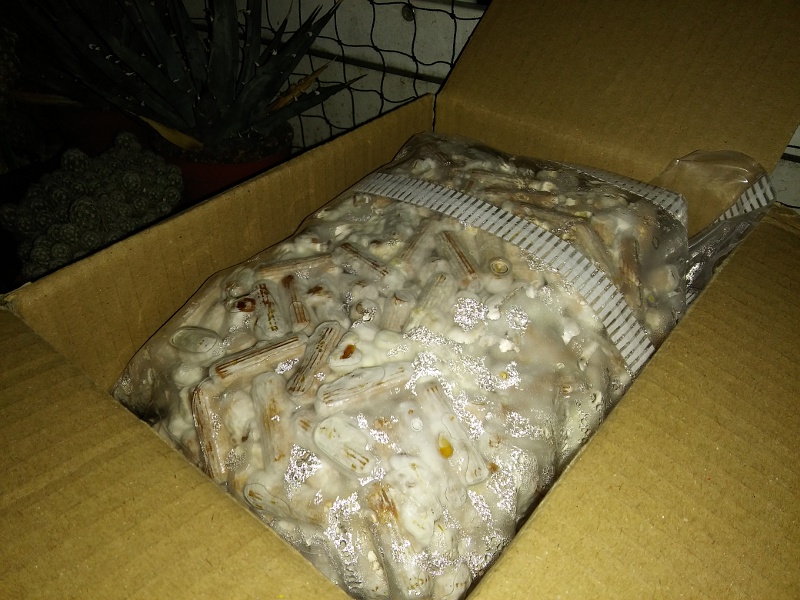 Die Rinde wird wichtig für die Primordienbildung (Fruchtkörperbildung) sein, denke ich. Wenn man Shiitake in Beuteln züchtet, hat man i.d.R. Sägespäne und keine Rinde. Man lässt de Pilz im Beutel "reifen". Sauerstoff, Licht, Kälteschock und Schläge lassen den Shiitake dann auch auf dem Substrat fruchten. Erst sieht das dann so aus wenn sie ausgepackt sind: